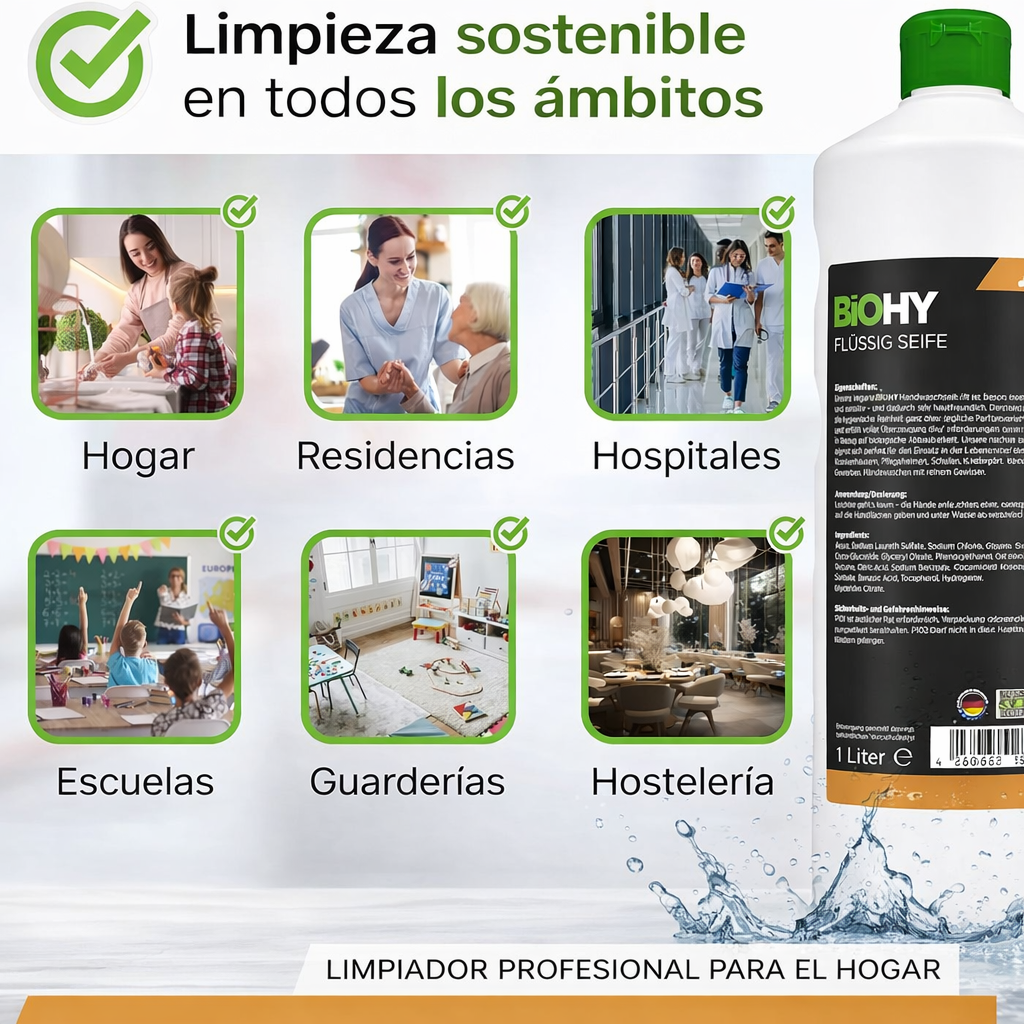 - 🌱 CUIDADO NATURALMENTE PERFECTO: Nuestro jabón BiOHY es particularmente adecuado para su uso en cocinas grandes, en la industria alimentaria, así como para inodoros y baños en la industria, comercio, escuelas, jardines de infancia, hoteles, restaurantes, hospitales y residencias de ancianos y de ancianos.